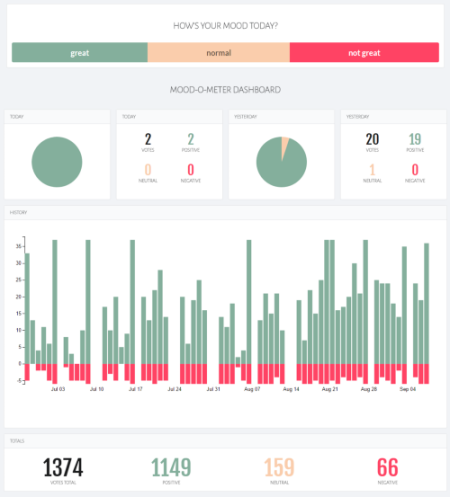 Conducting employee surveys every few months is a common and effective way to evaluate employee satisfaction. But we thought we could spice up this feedback process by providing our staff with an additional feedback channel that is fun to use and delivers practically up-to-the-minute results: the Mood-o-Meter. Press a button, express your mood and see company-wide results on a daily basis.