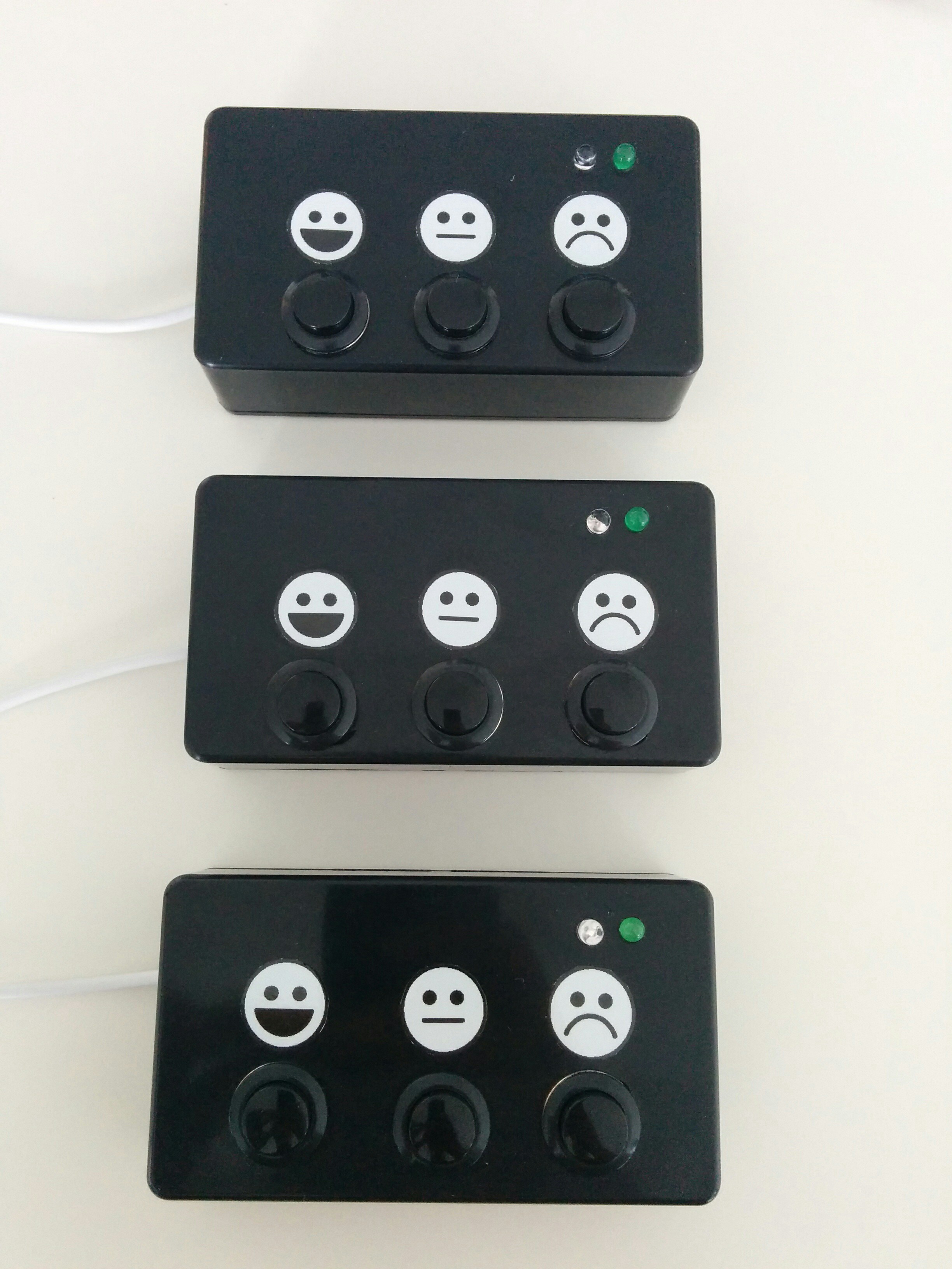 These buttons were hung up next to all exits in out office, so everyone could quickly press them on leaving. They were connected to the wifi network and were able to send the vote to the backend API.
