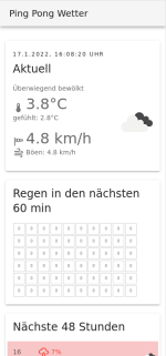 ping pong weather May 2021 Tiny Svelte app to tell if it's good weather for outdoor ping pong (rain & wind) at our default spot. Tech: Using weather data from OpenWeatherMap Svelte Svelte Materialify (UI) Tags: JavaScript, Svelte << back to project overview